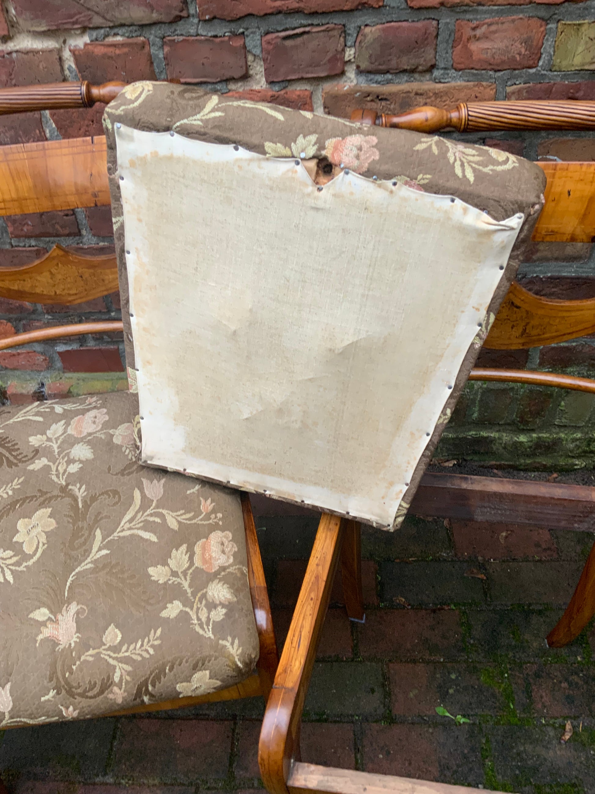 Sehr schönes Set in gutem Patinazustand , Bezugstoff verbraucht , Aufbereitung durch Polstere auf Anfrage zum Festpreis, Höhe der Lehne 82 cm , Sitzhöhe 48 cm , Sitzfäche 45 cm in der Breite und 38 cm in der Tiefe , schön geformte Lehn , mit Steg und schöner Blende .