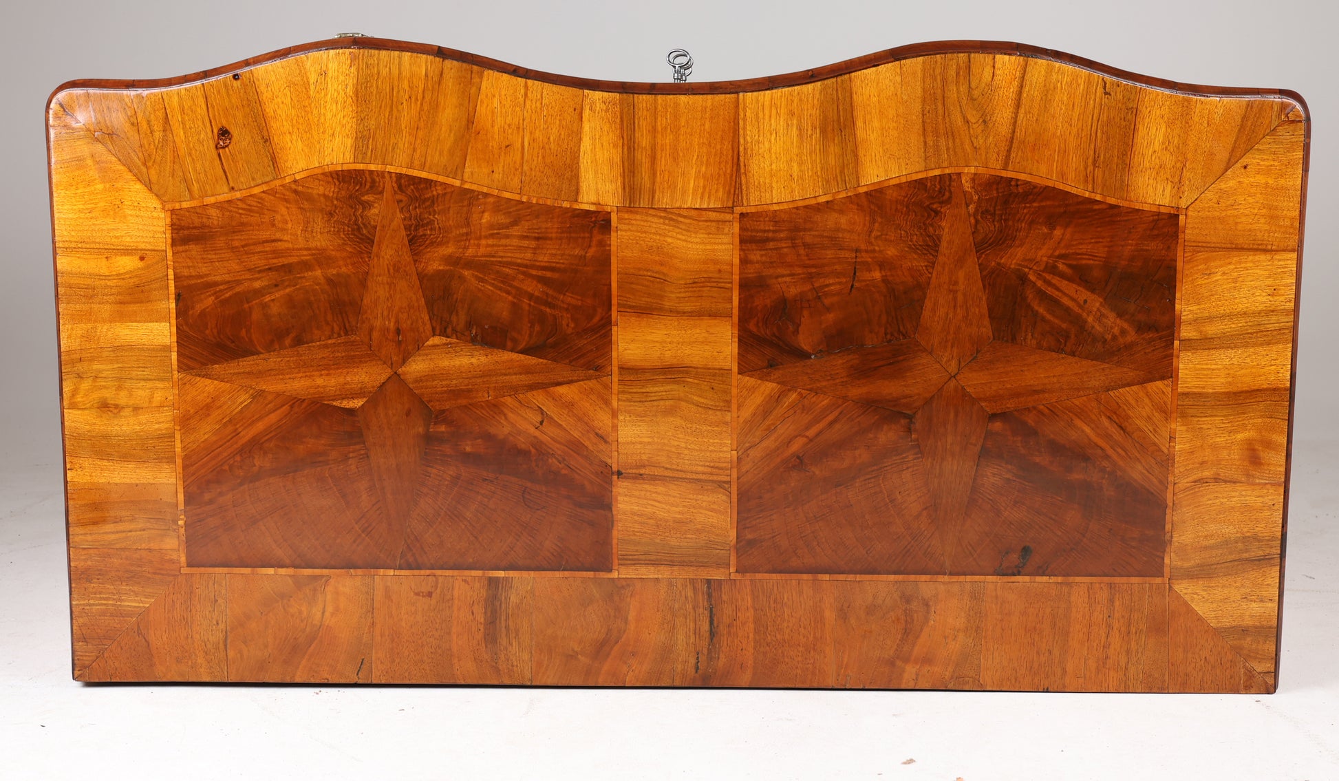 Sehr schöne originale Kommode in Nussbaum furniert Frankreich um 1780 , Deckplatte mit 2 großen Feldern eingelegt, umfaßt von Bandelwerk , mit 2 Sternintarsien , 3 gebauchte Schübe mit originalen Beschlägen , Kastenschlössern , 3 Schlüssel dabei , an den Schubfachblenden mit verschlungenen Intarsien in Esche und Zwetschge eingelegt , behutsam restauriert und mit Schellack handpoliert , Korpus ruht auf einer Zarge mit leicht gekrümmten Füßen . Maße : Breite 123 cm , Tiefe 63 cm und 95 cm Höhe .
