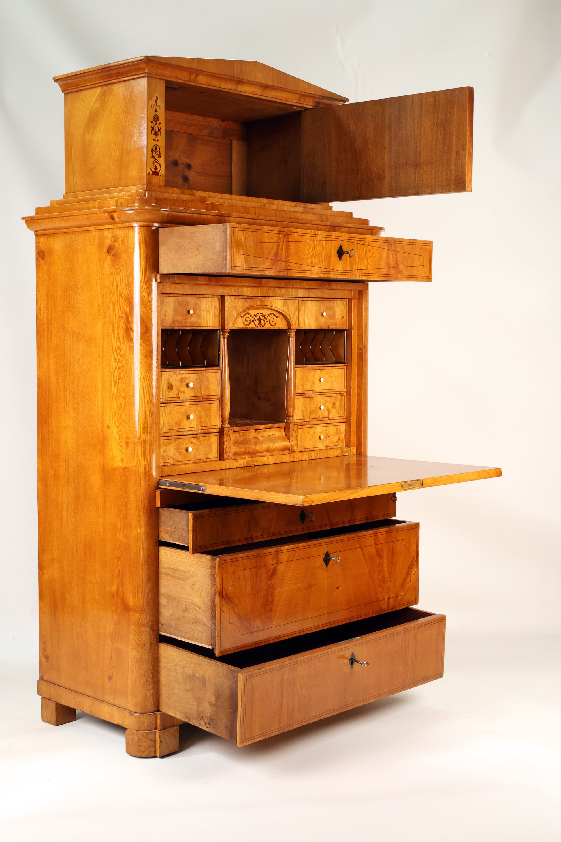 Ich biete einen restaurierten Sekretär in sehr schöner Maserung , Aufsatz mit kleiner Tür , an den Lisenen intarsiert , 4 große Schübe alle Schlüssel dabei , sehr schönes Kabinett , im Mittelraum mit intarsiertem Boden , darunter Schubfach mit Druckfeder , öffnet sich durch Gegendruck , sehr schöner Farbton , behutsam restauriert und mit Schellack handpoliert . Korpus ruht auf Klotzfüßen.