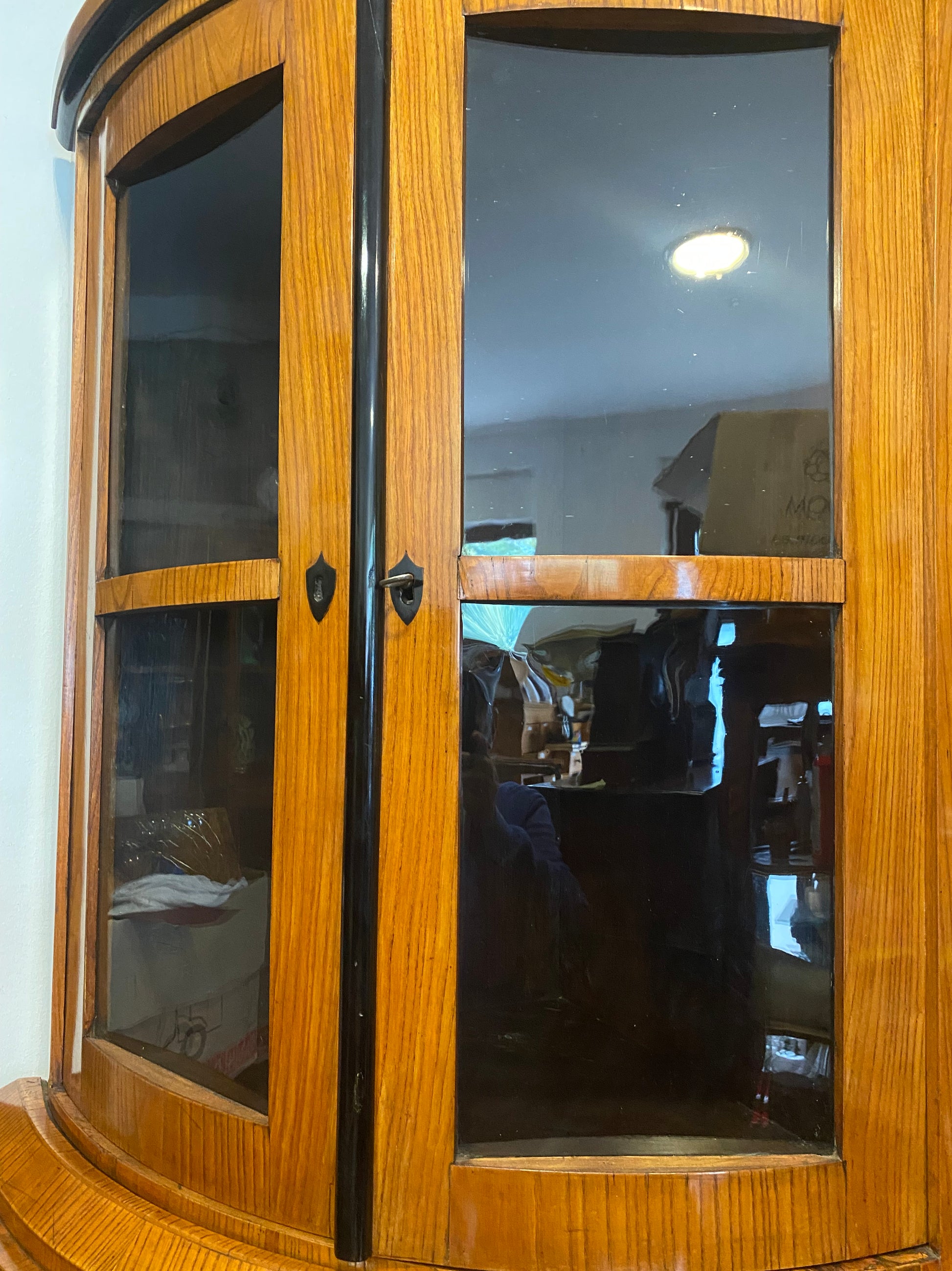 Originale Eckvitrine , in Esche furniert , Oberteil verglast mit Einlegeböden , folgend das Brotfach , darunter , 2 türiges Unterteil , behutsam restauriert und mit Schellack handpoliert , sehr formschöner Eckschrank , Korpus ruht auf Klotzfüßen . Maße : Höhe 215 cm , Schenkelmaß 72 cm und Breite in der Vorderfront 110 cm . Versand bundesweit 120 € . Europaweiter Versand insbesondere Italien , Spanien , Schweiz , Österreich , Frankreich und Beneluxländer auf Anfrage zum Festepreis .