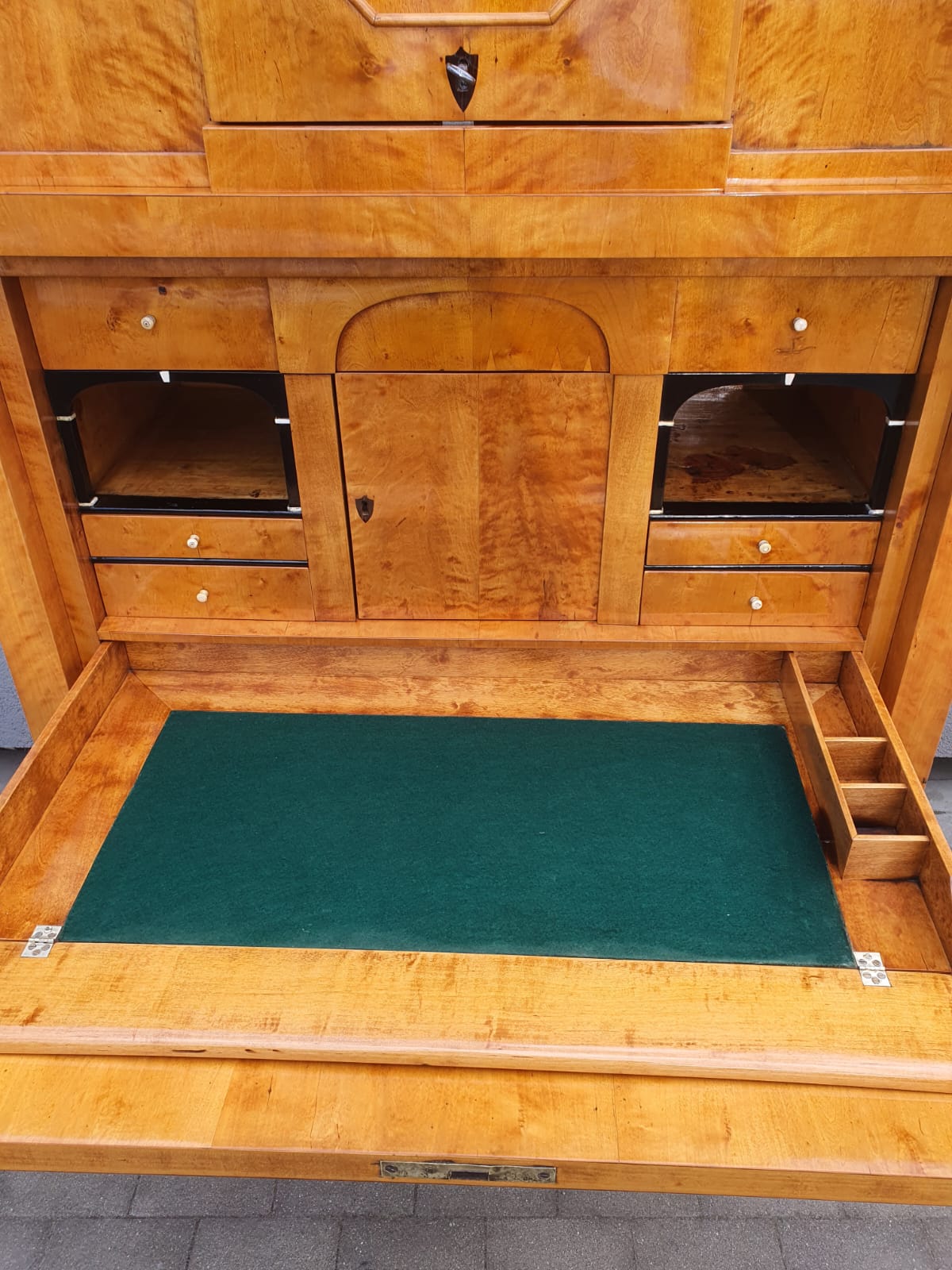 Originaler Sekretär mit Aufsatz , in schöner Birkemaserung , sehr schönes Kabinett , mit kleinen Schüben , über der Schreibklappe , separate Auszug für Laptop und IPad oder zum Schreben , behutsam restauriert und mit Schellack handpoliert , große Schübe viel Stauraum , alle Schlüssel dabei . Maße : Höhe 184 cm , Breite99 cm und Tiefe 49 cm .