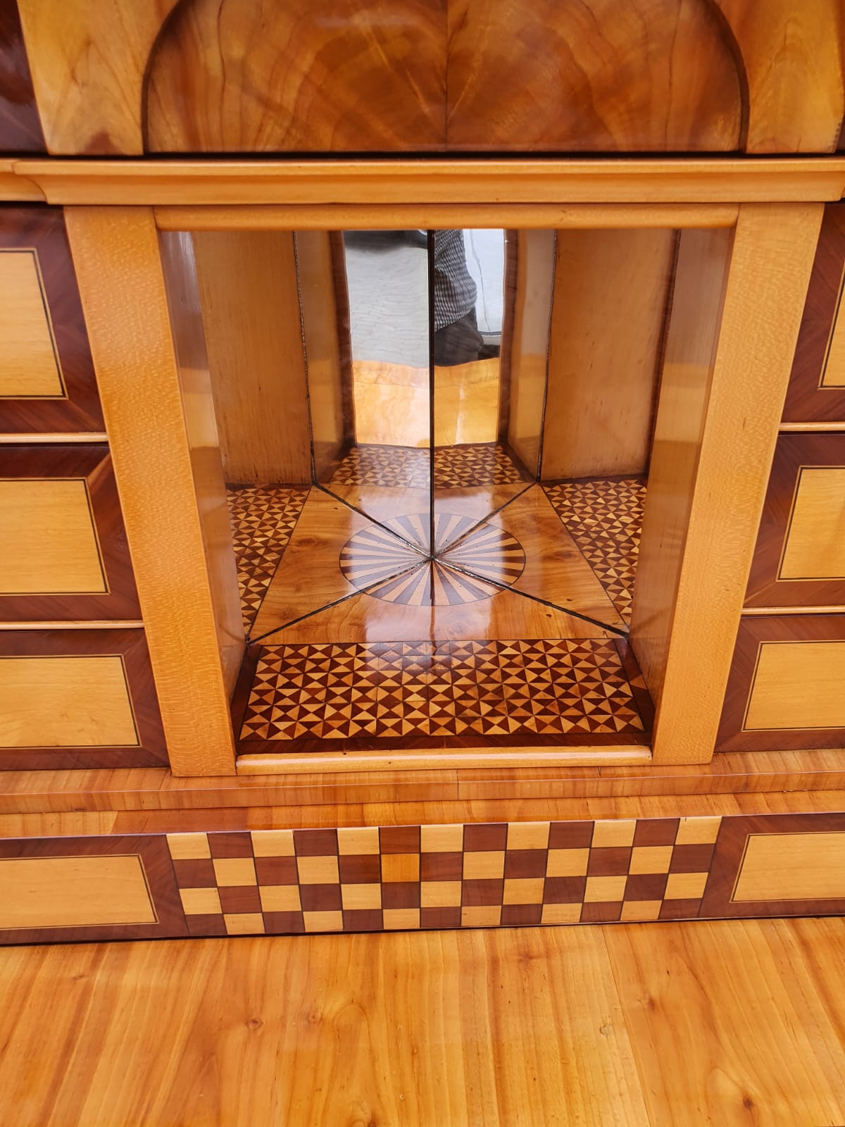 Originaler Sekretär in sehr schöner Kirschbaummaserung , mit Kopfschub , sehr schönes Kabinett , Vorderfront flankiert von Vollsäulen, behutsam restauriert und mit Schellack handpoliert , Korpus ruht auf Klotzfüßen. Maße : Höhe 179 cm , Tiefe 60 cm und Breite 104 cm .