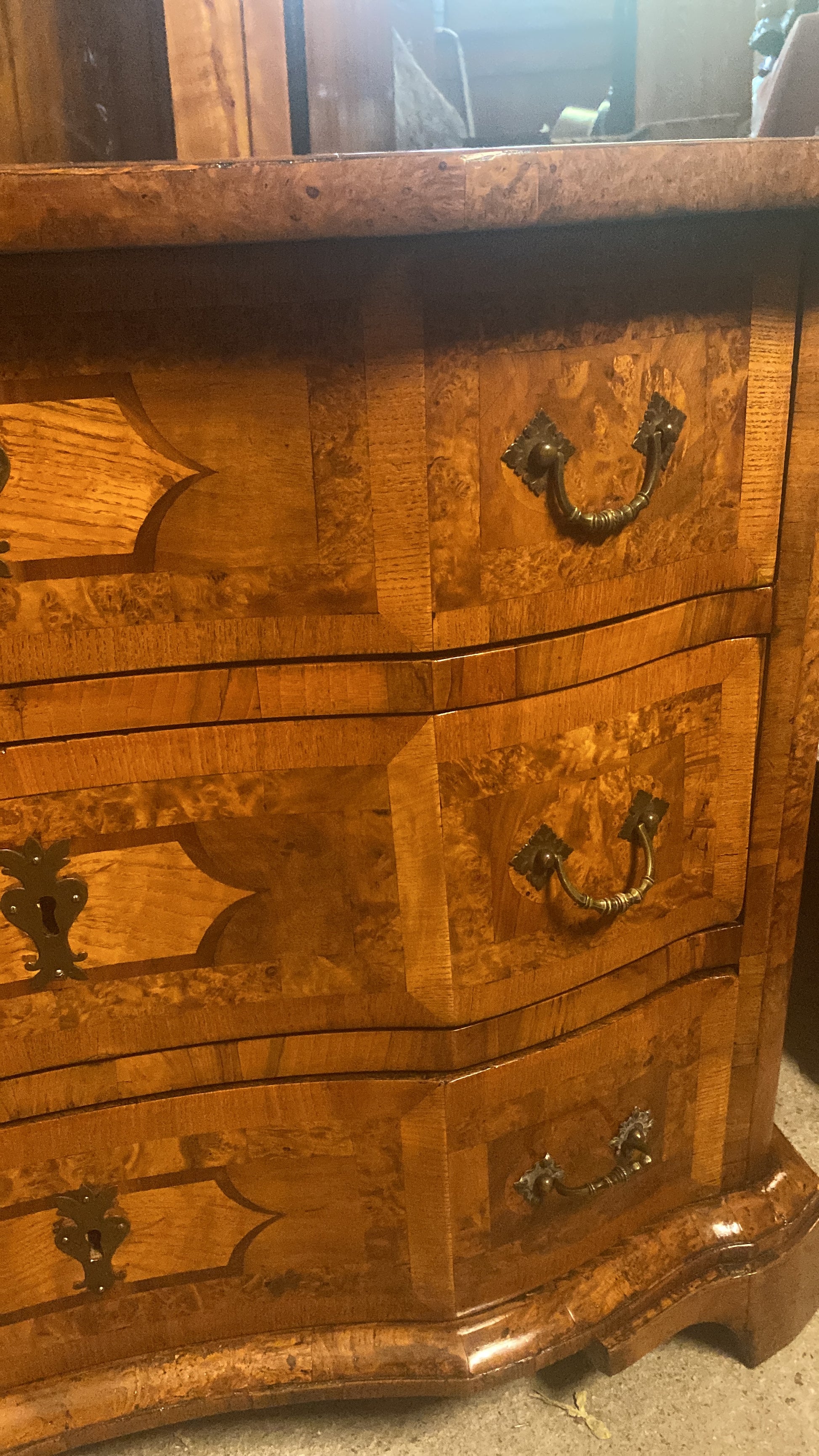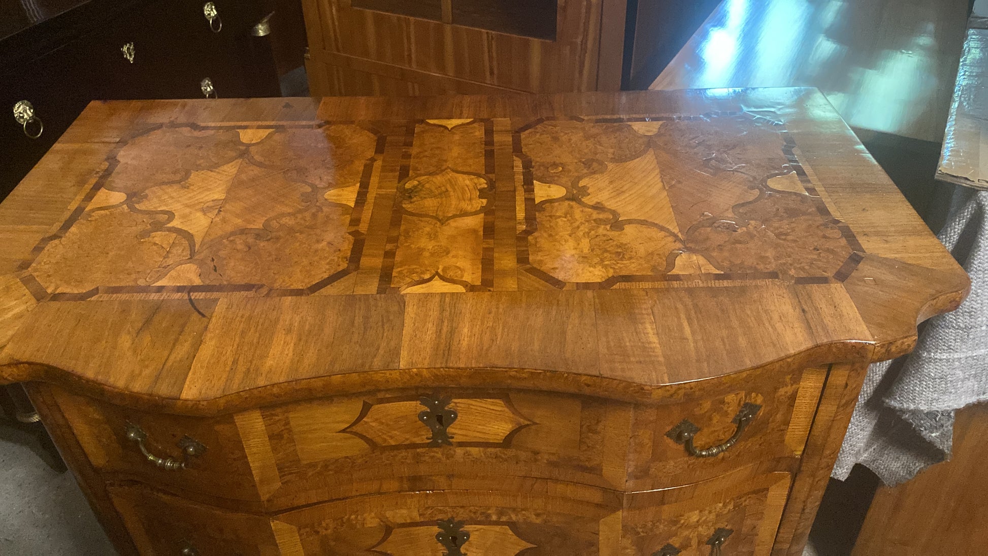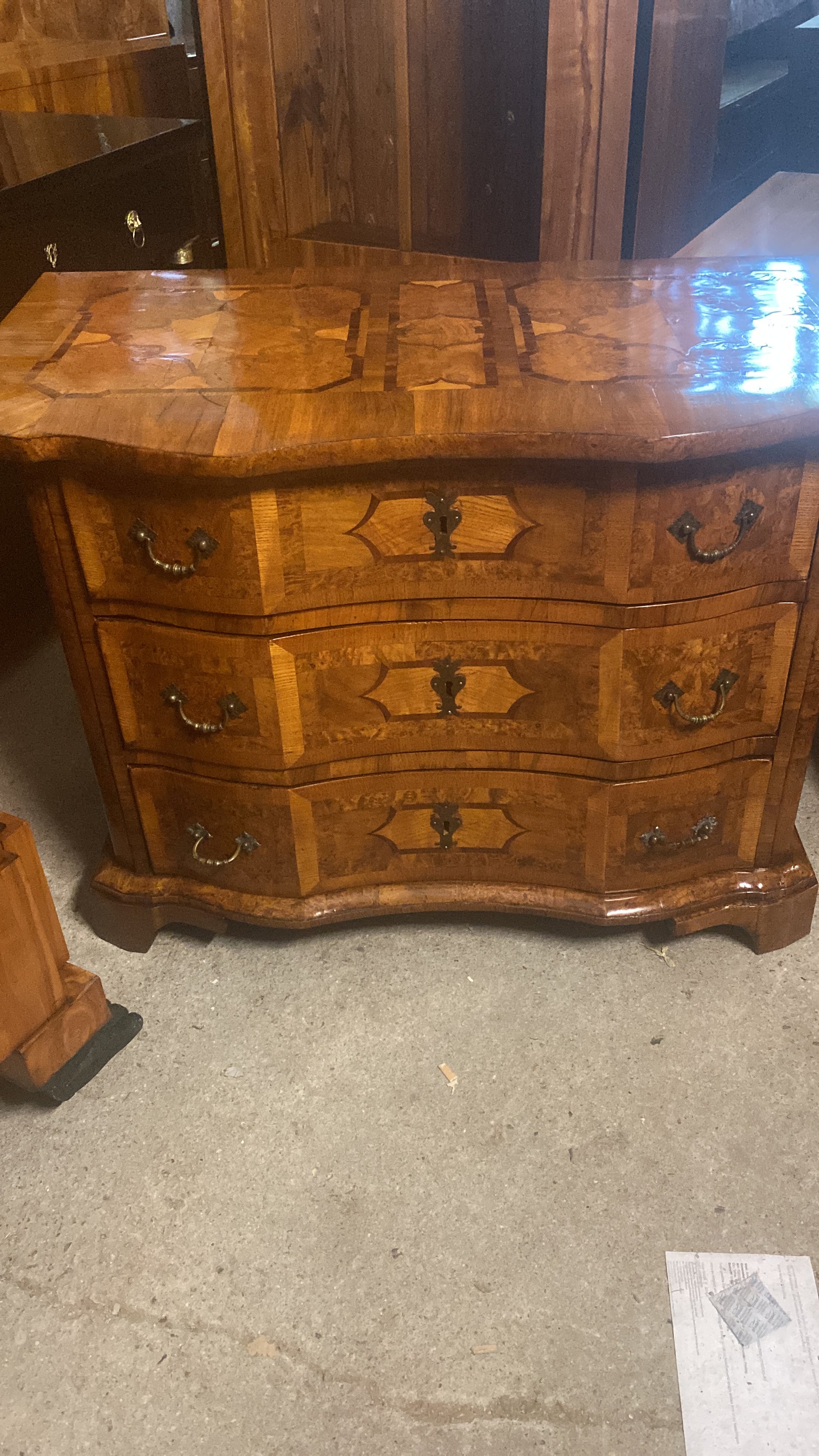 Ich biete eine originale Kommode , mit geschwungener Deckplatte , 3 geknickte Schübe , schön intarsiert , meisterhaft eingelegtes Bandelwerk , goldener Farbton , originale Beschläge , 3 Kastenschlösser , 3 Schlüssel , behutsam restauriert und mit Schellack handpoliert , sehr formschöne Kommode , Korpus ruht auf Zargenfüßen.Maße : Breite 110 cm , Tiefe 62 cm und Höhe 79 cm .