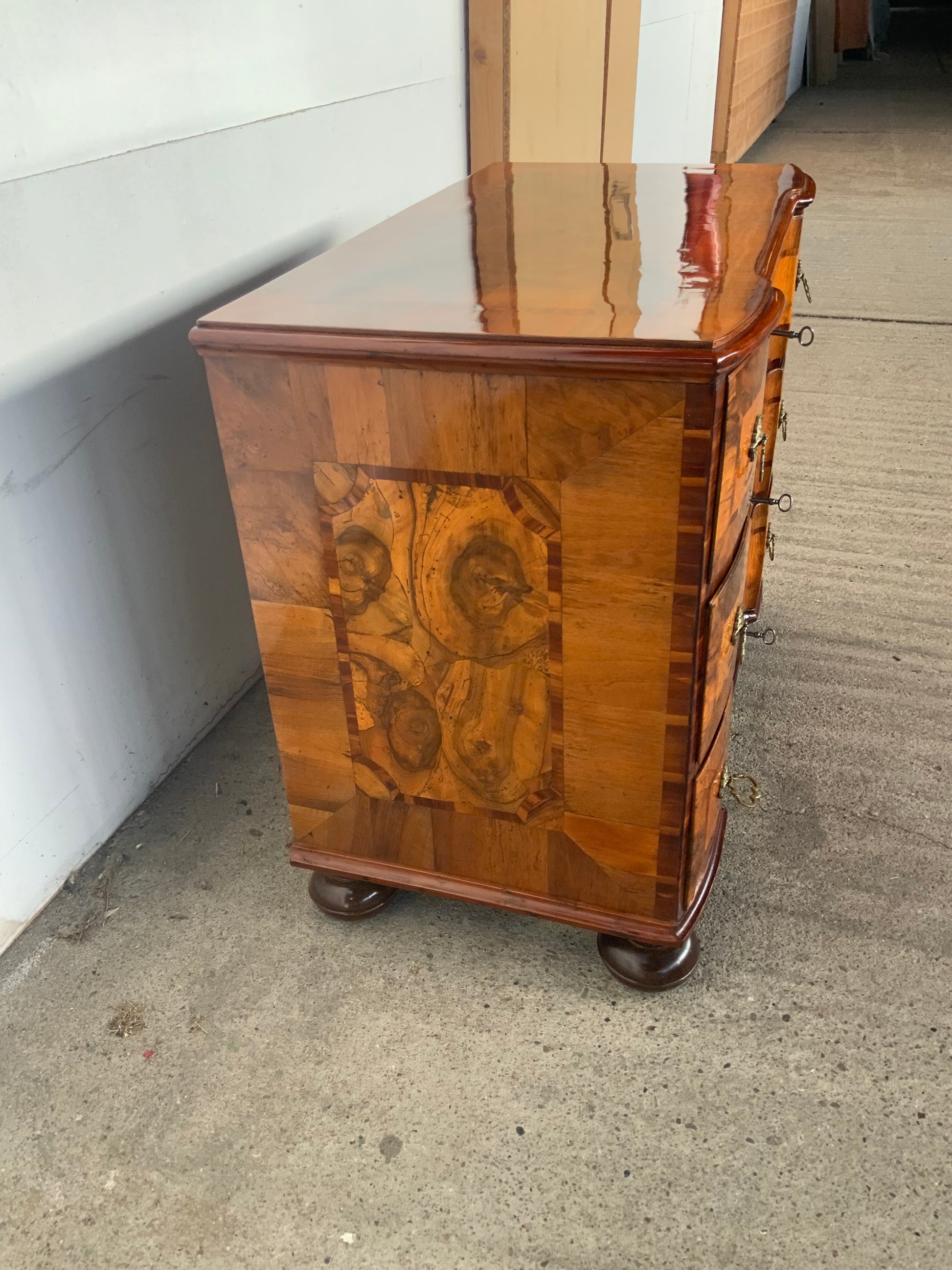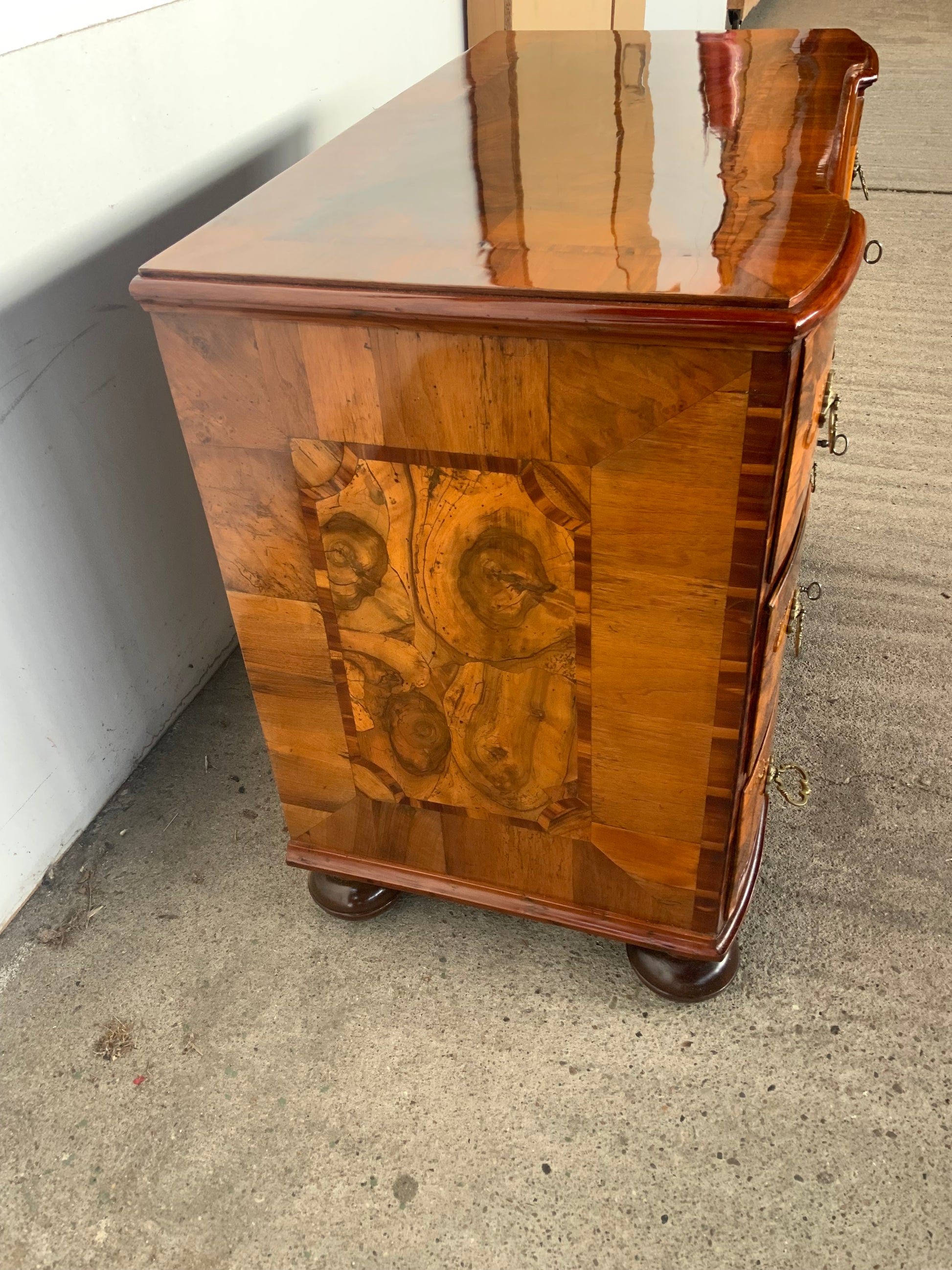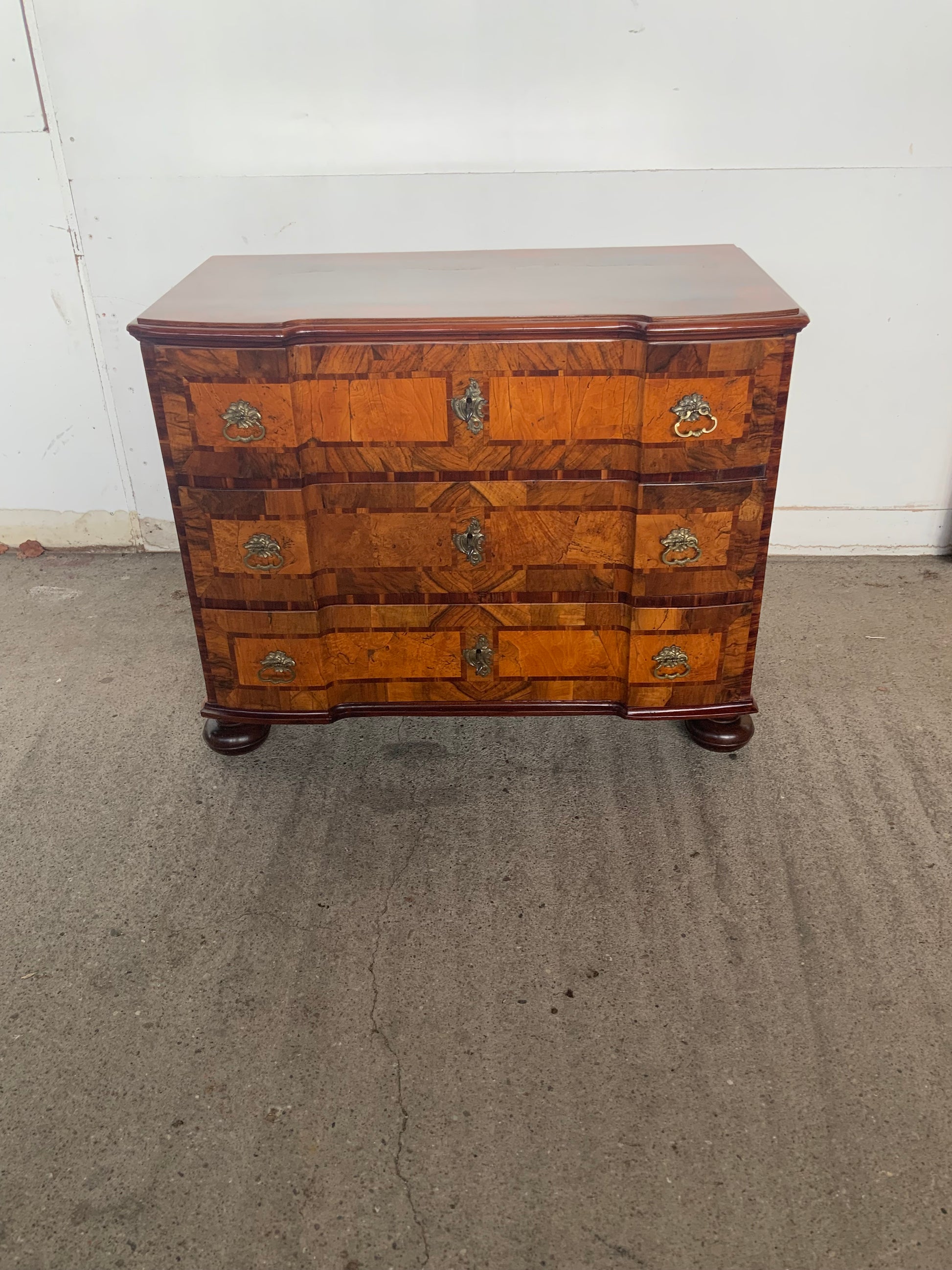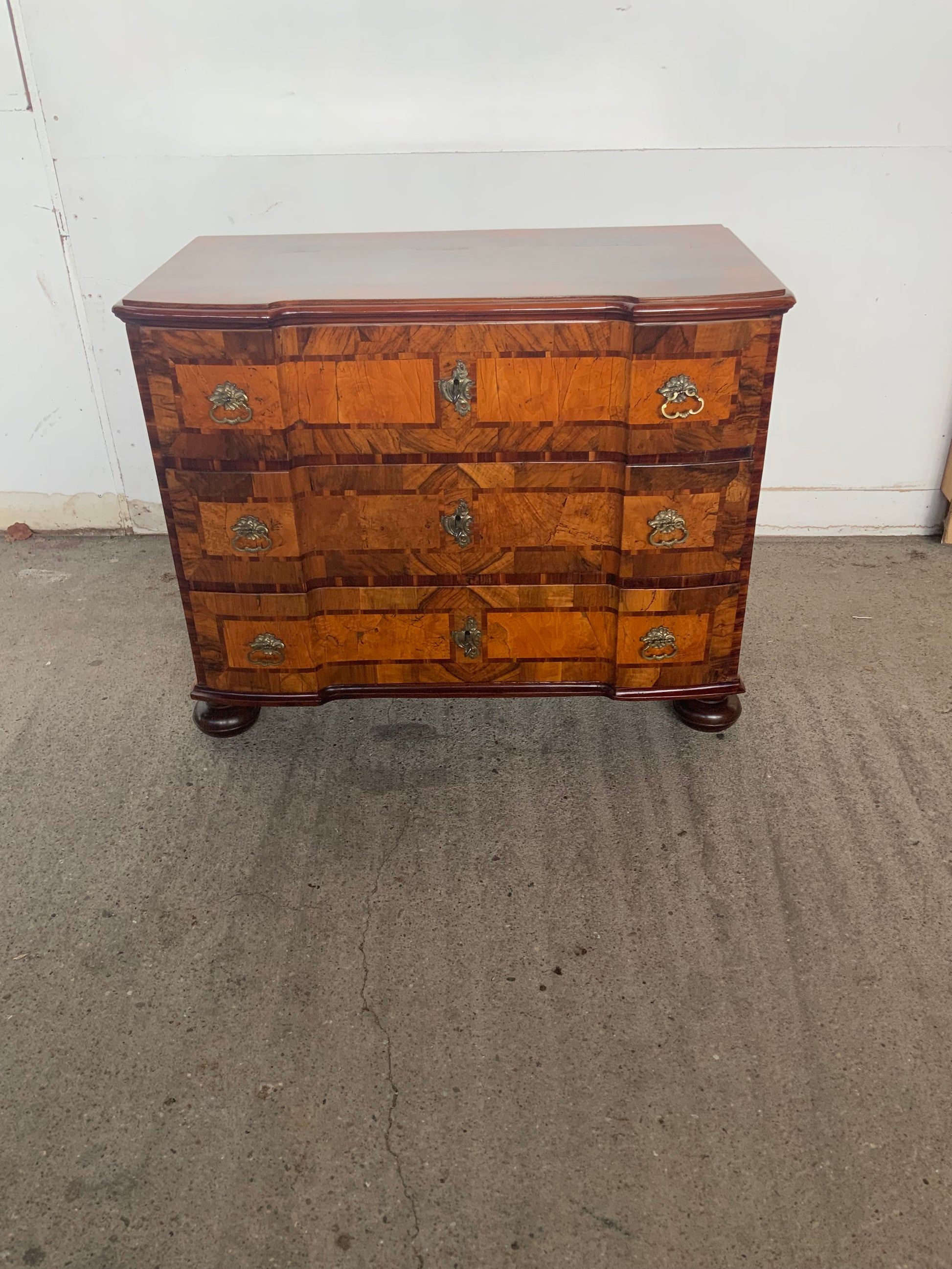 Ein wahres Schmuckstück aus der Barockzeit , Deckplatte mit Kreuzfuge , 3 doppelt geknickte Schübe in Nussbaum und Nusswurzelfurnier , originale Beschläge , Kastenschlösser ergänzt , 3 Schlüssel dabei , Seitenwände mit großem Feld eingelegt . Behutsam restauriert und mit Schellack handpoliert . Korpus ruht auf gequetschten Kugelfüßen . Maße : Breite 103,5 cm , Tiefe 55 cm und Höhe 81,5 cm .