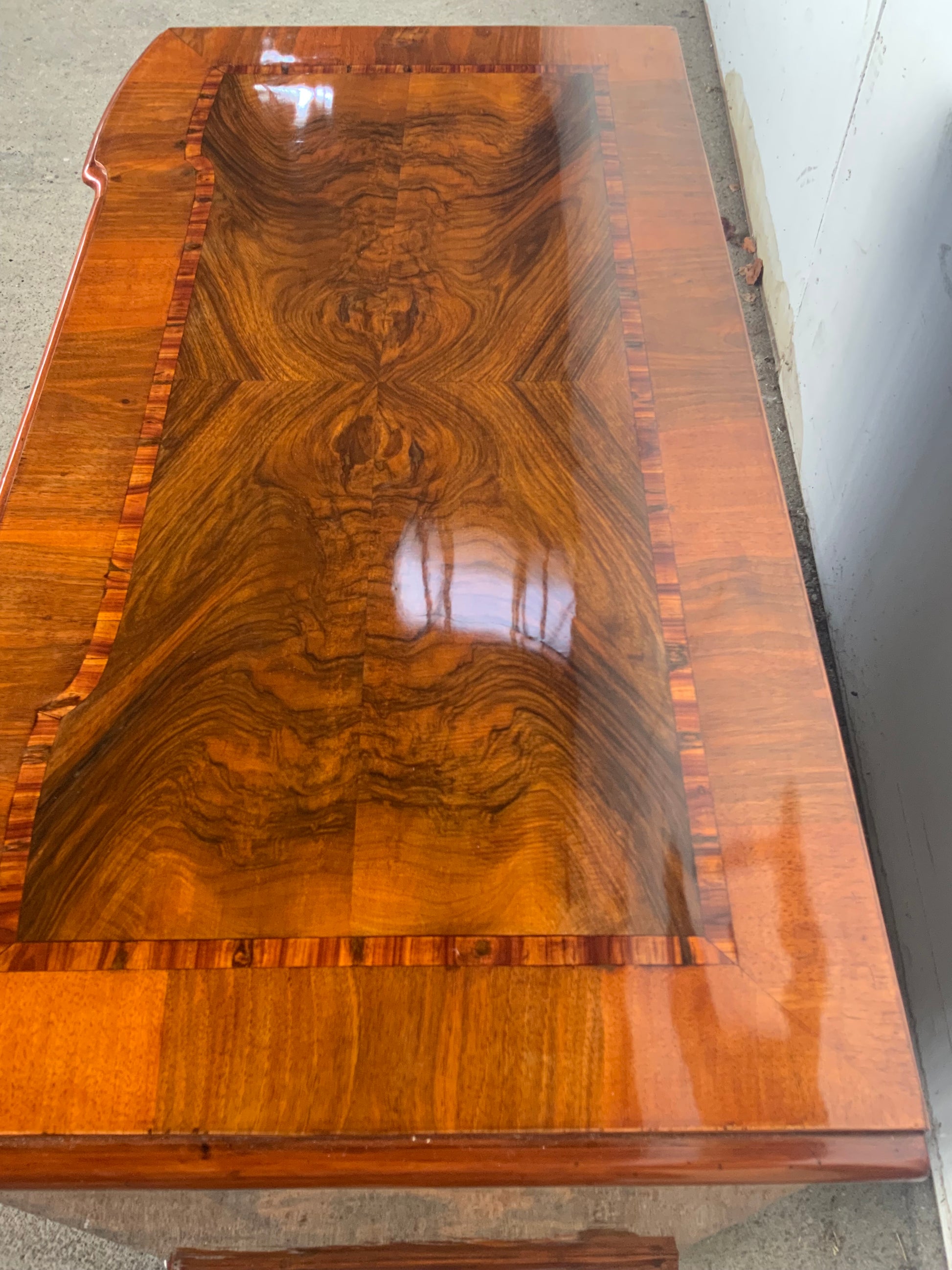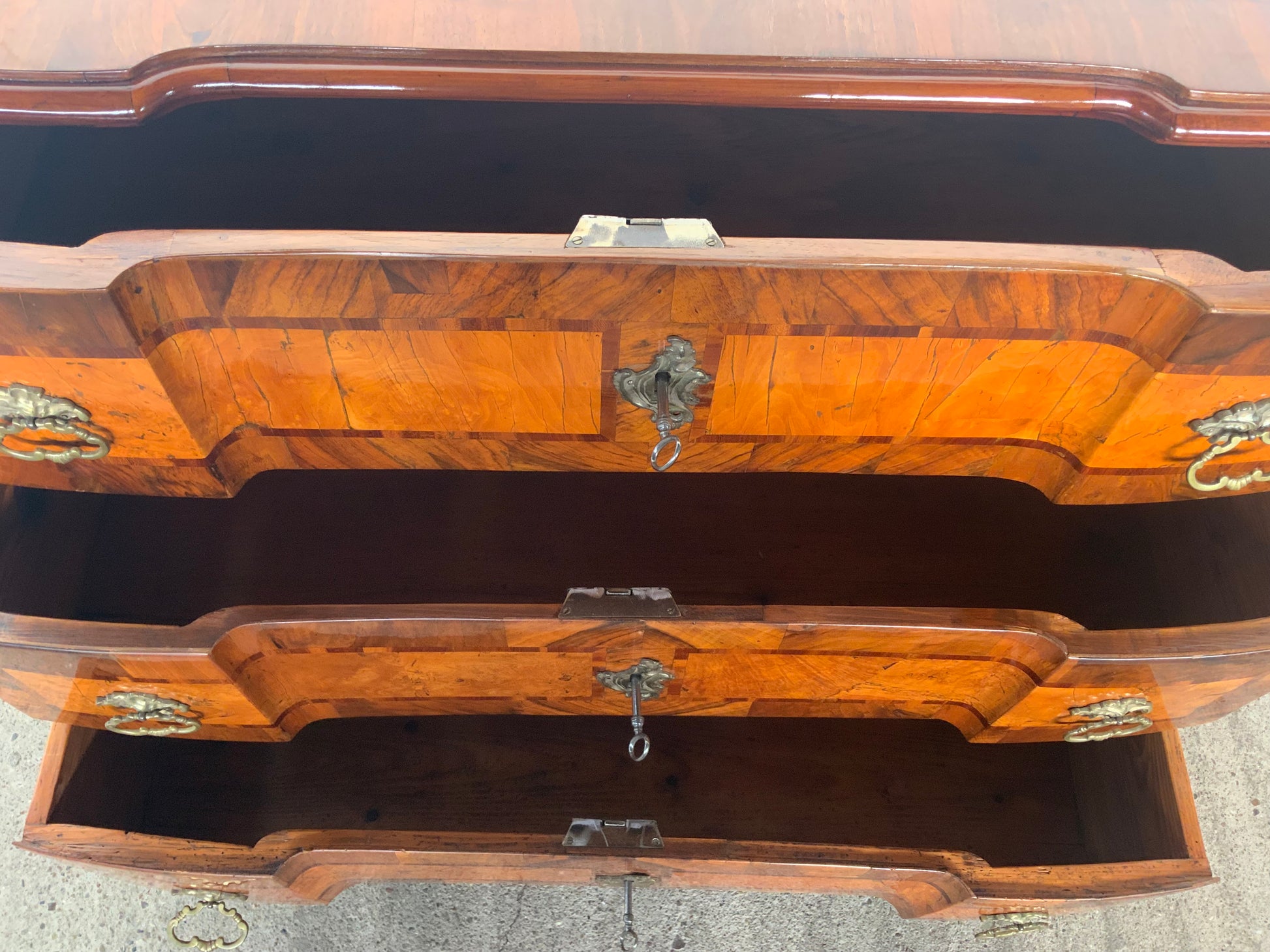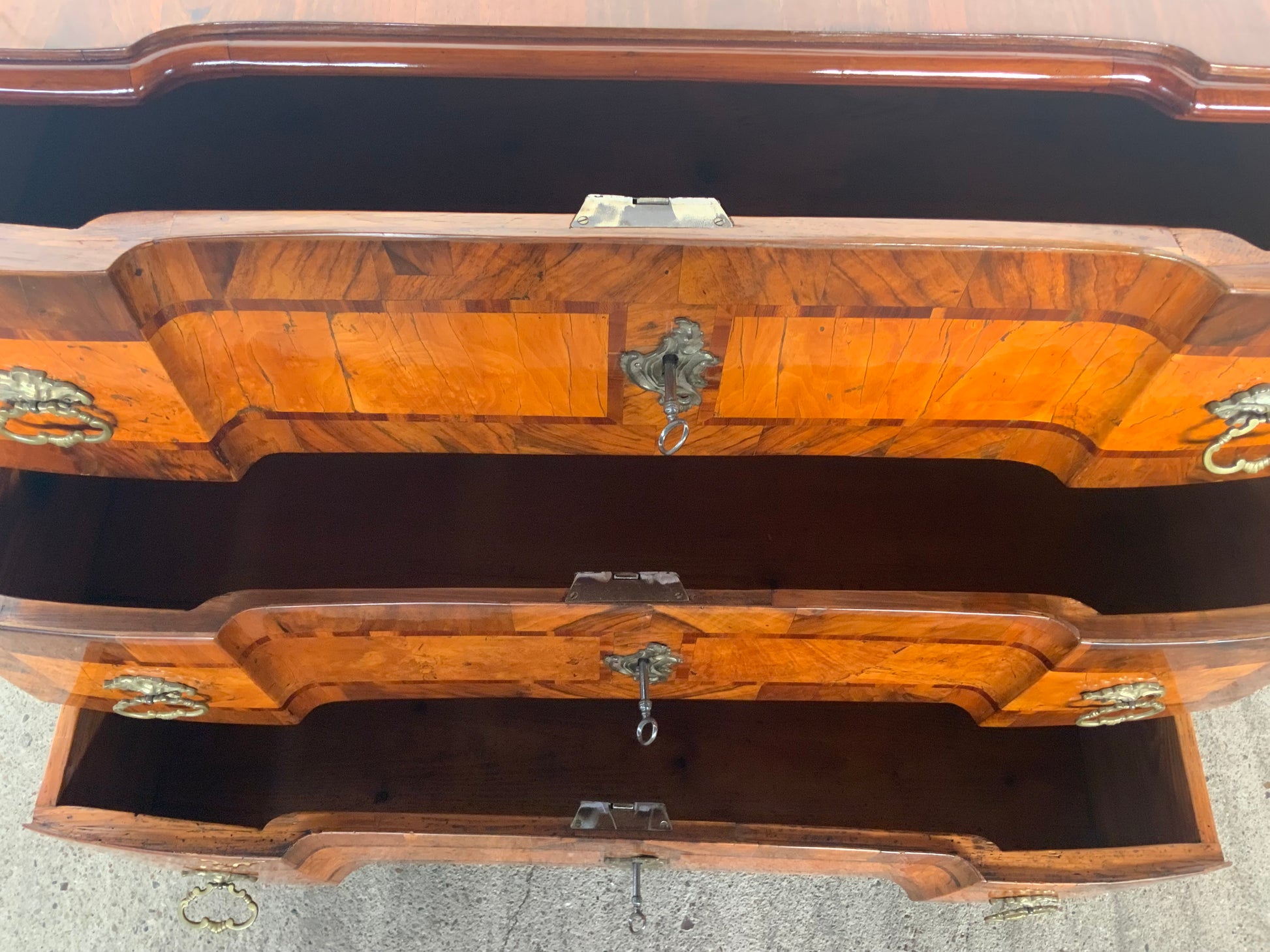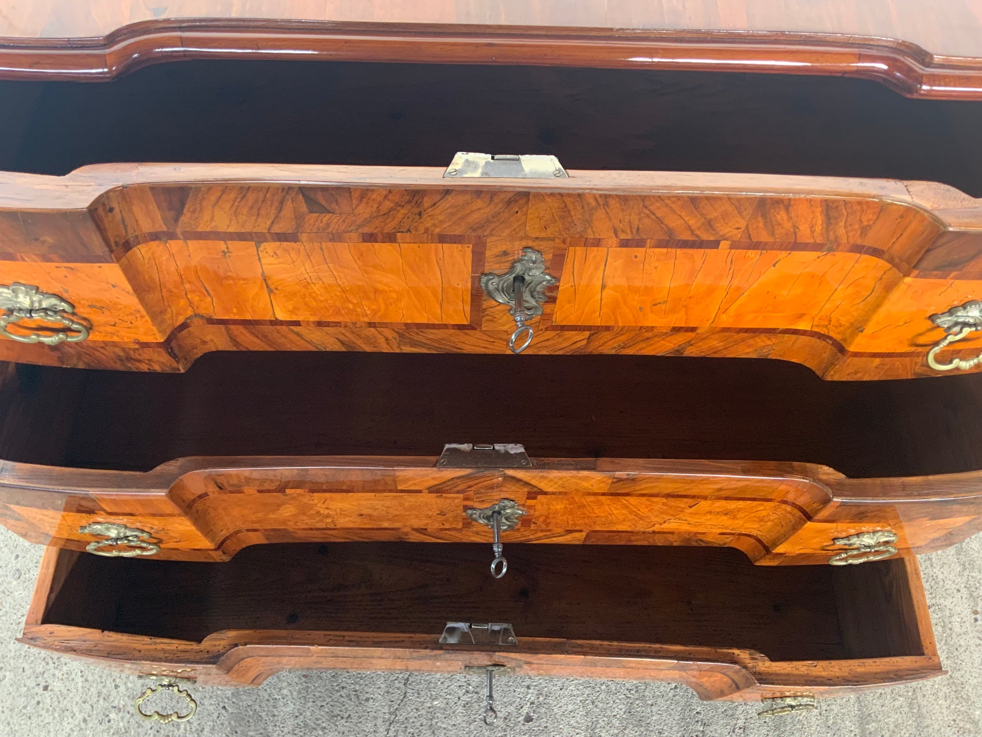 Ein wahres Schmuckstück aus der Barockzeit , Deckplatte mit Kreuzfuge , 3 doppelt geknickte Schübe in Nussbaum und Nusswurzelfurnier , originale Beschläge , Kastenschlösser ergänzt , 3 Schlüssel dabei , Seitenwände mit großem Feld eingelegt . Behutsam restauriert und mit Schellack handpoliert . Korpus ruht auf gequetschten Kugelfüßen . Maße : Breite 103,5 cm , Tiefe 55 cm und Höhe 81,5 cm .