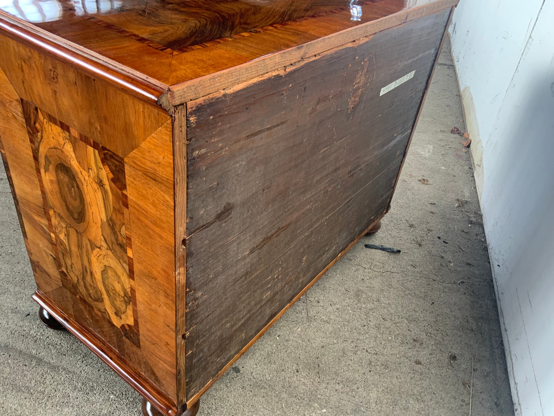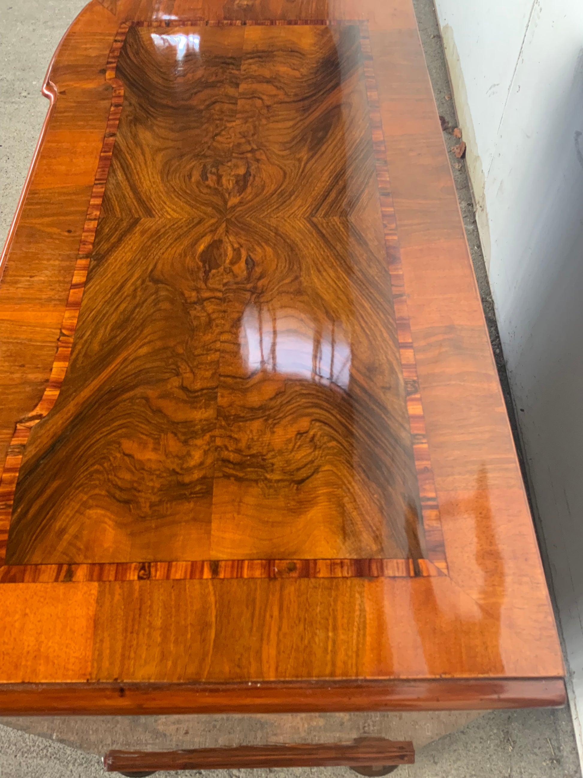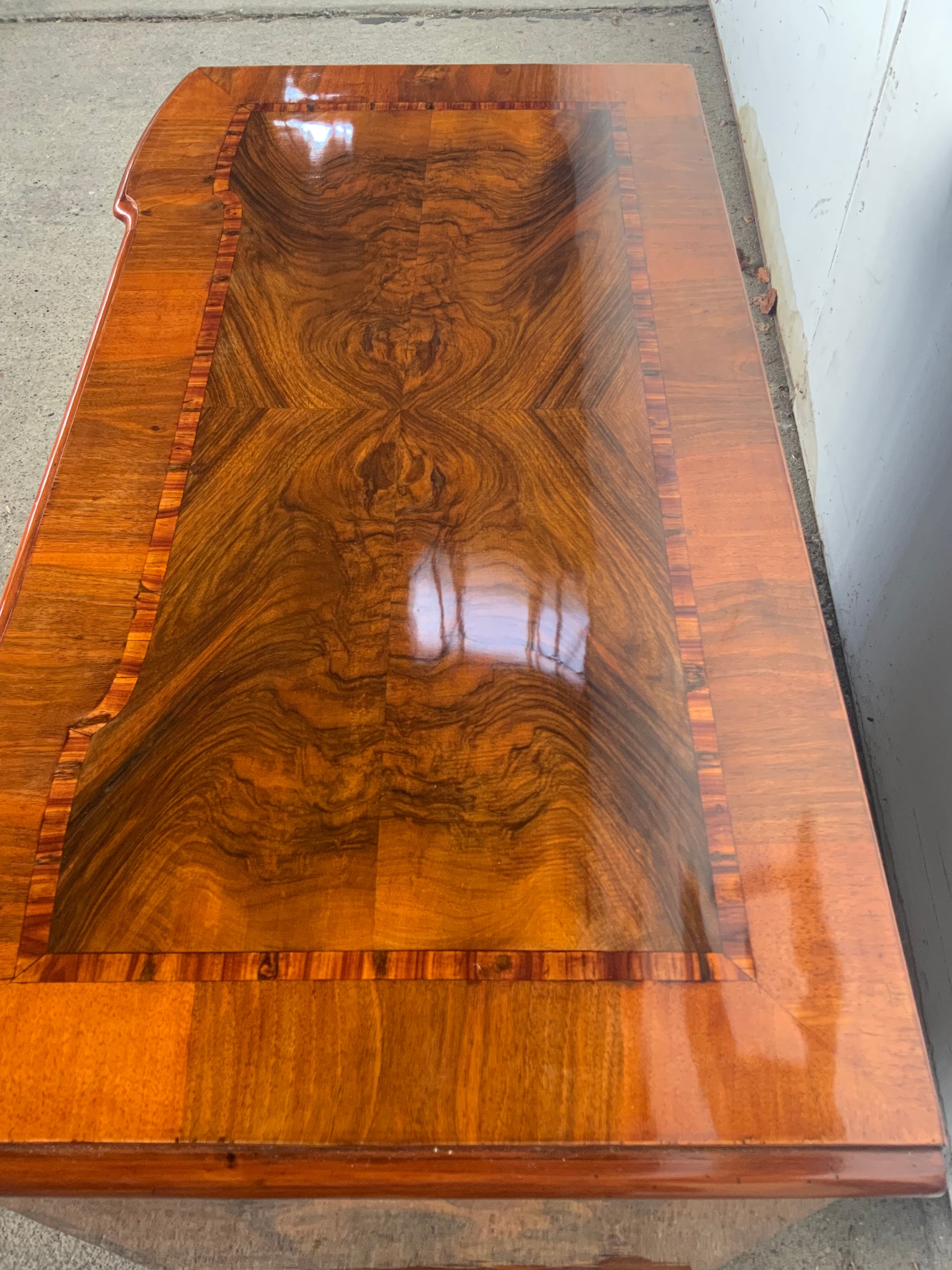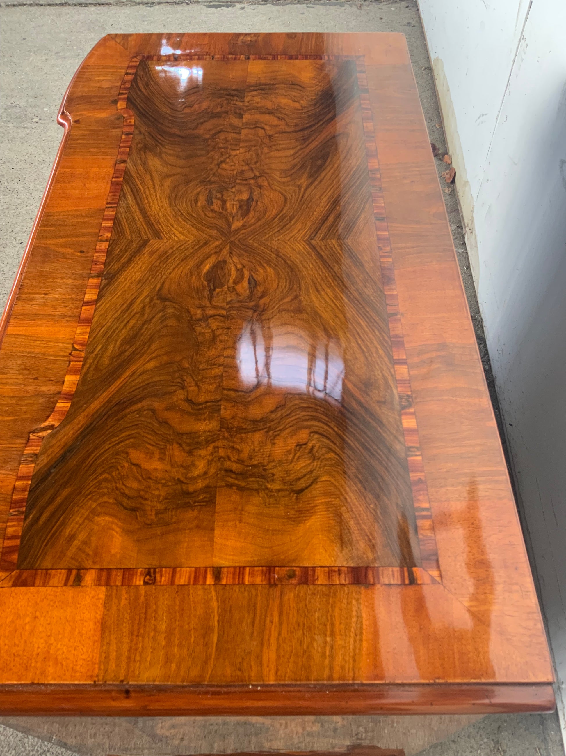 Ein wahres Schmuckstück aus der Barockzeit , Deckplatte mit Kreuzfuge , 3 doppelt geknickte Schübe in Nussbaum und Nusswurzelfurnier , originale Beschläge , Kastenschlösser ergänzt , 3 Schlüssel dabei , Seitenwände mit großem Feld eingelegt . Behutsam restauriert und mit Schellack handpoliert . Korpus ruht auf gequetschten Kugelfüßen . Maße : Breite 103,5 cm , Tiefe 55 cm und Höhe 81,5 cm .